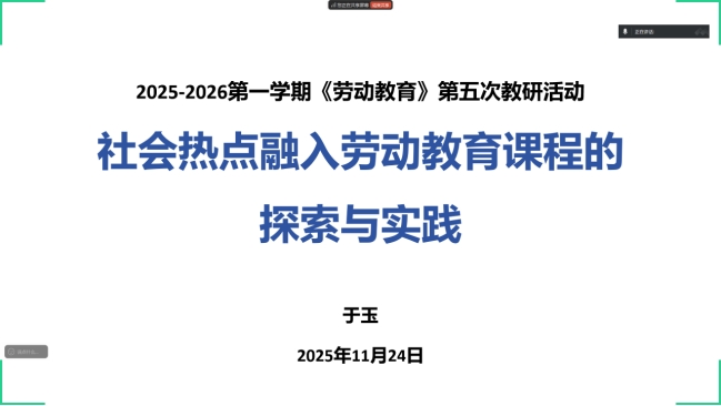2025年11月24日,劳动教育虚拟教研室围绕“社会热点融入劳动教育课程的探索与实践”开展教学研讨,活动由教研室副主任于玉主持,三校区任课教师共同参加。