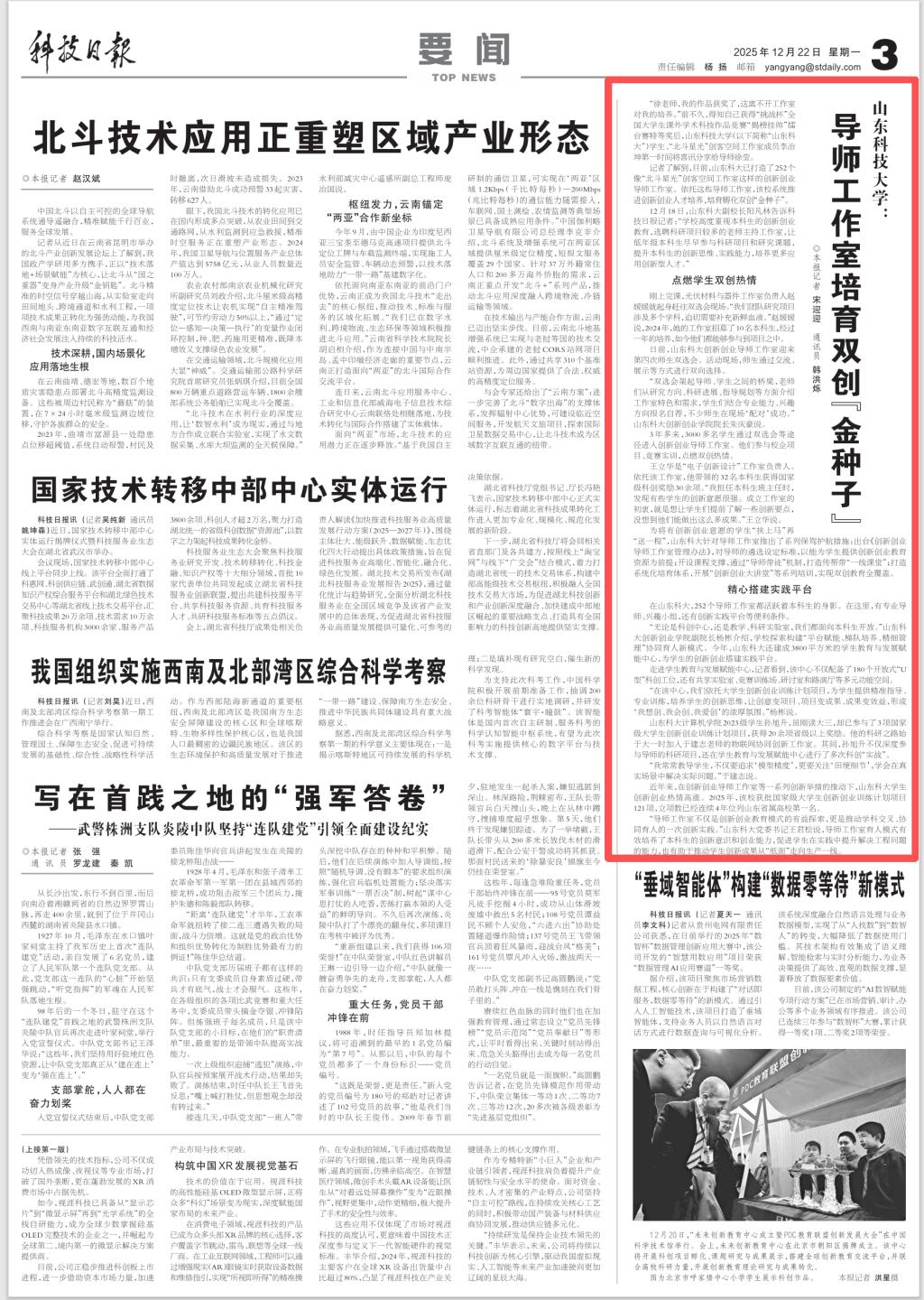 “导师工作室不仅是创新创业教育模式的有益探索,更是推动学科交叉、协同育人的一次创新实践。”山东科大党委书记王君松说,导师工作室育人模式有效培养了本科生的创新意识和创业能力,促进学生在实践中提升解决工程问题的能力,也有助于推动学生创新成果从“纸面”走向生产一线。